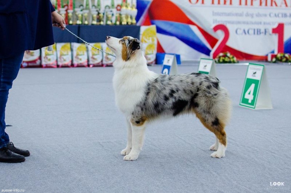 Стандартного роста, хорошая подготовка, отличная физическая форма, выглядит моложе возраста, женственная голова в стадии формирования, чуть свободные уши, незначительный депигмент в пределах допустимого по возрасту, отличный выход шеи, углы и рычаги передних конечностей, чуть коротковат круп, бедро широкое, но коротковато, стабильные движения