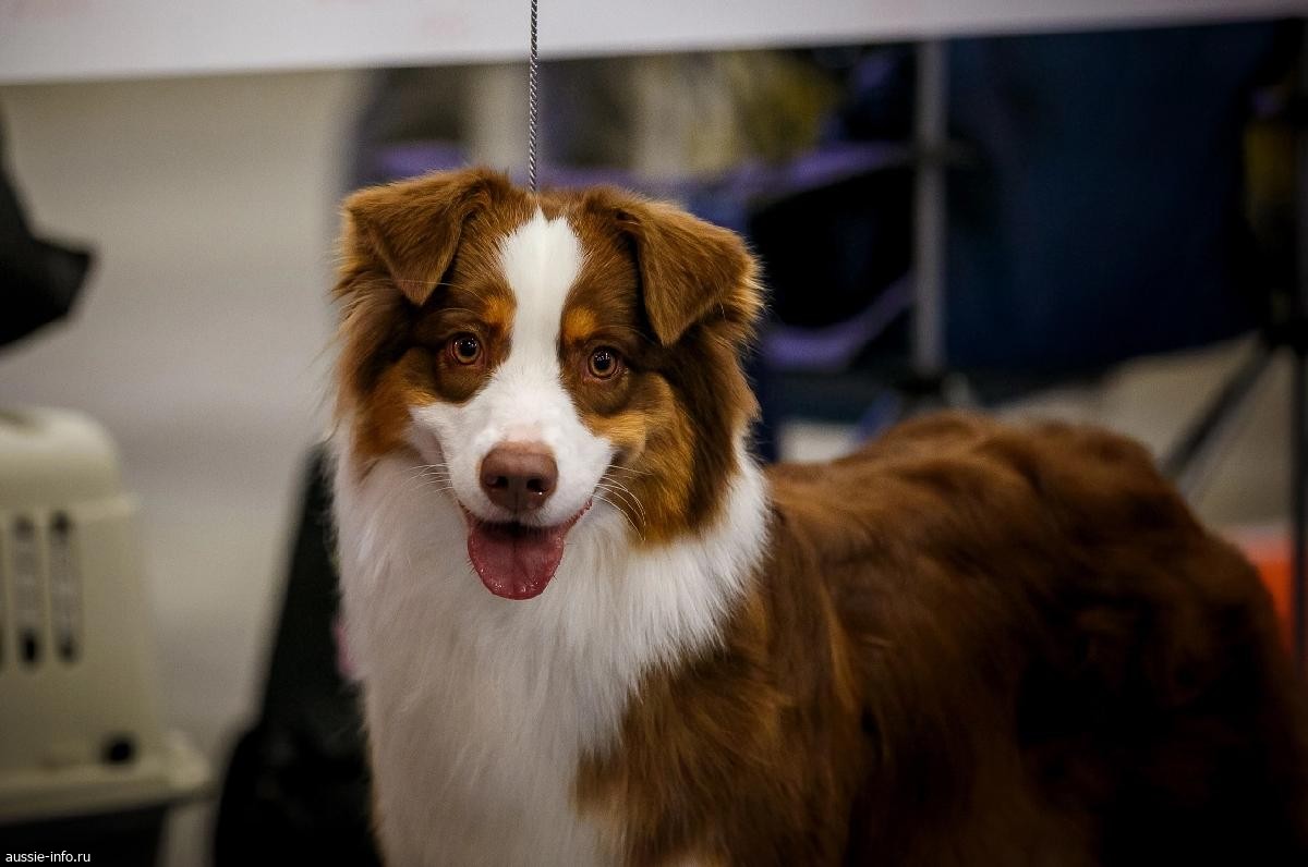 Достаточно крепкая, компактный объемный корпус, хорошо развита по возрасту, хорошие линии и пропорции головы, корректный фронт, хорошие углы задних конечностей, чуть подставляет колени под корпус